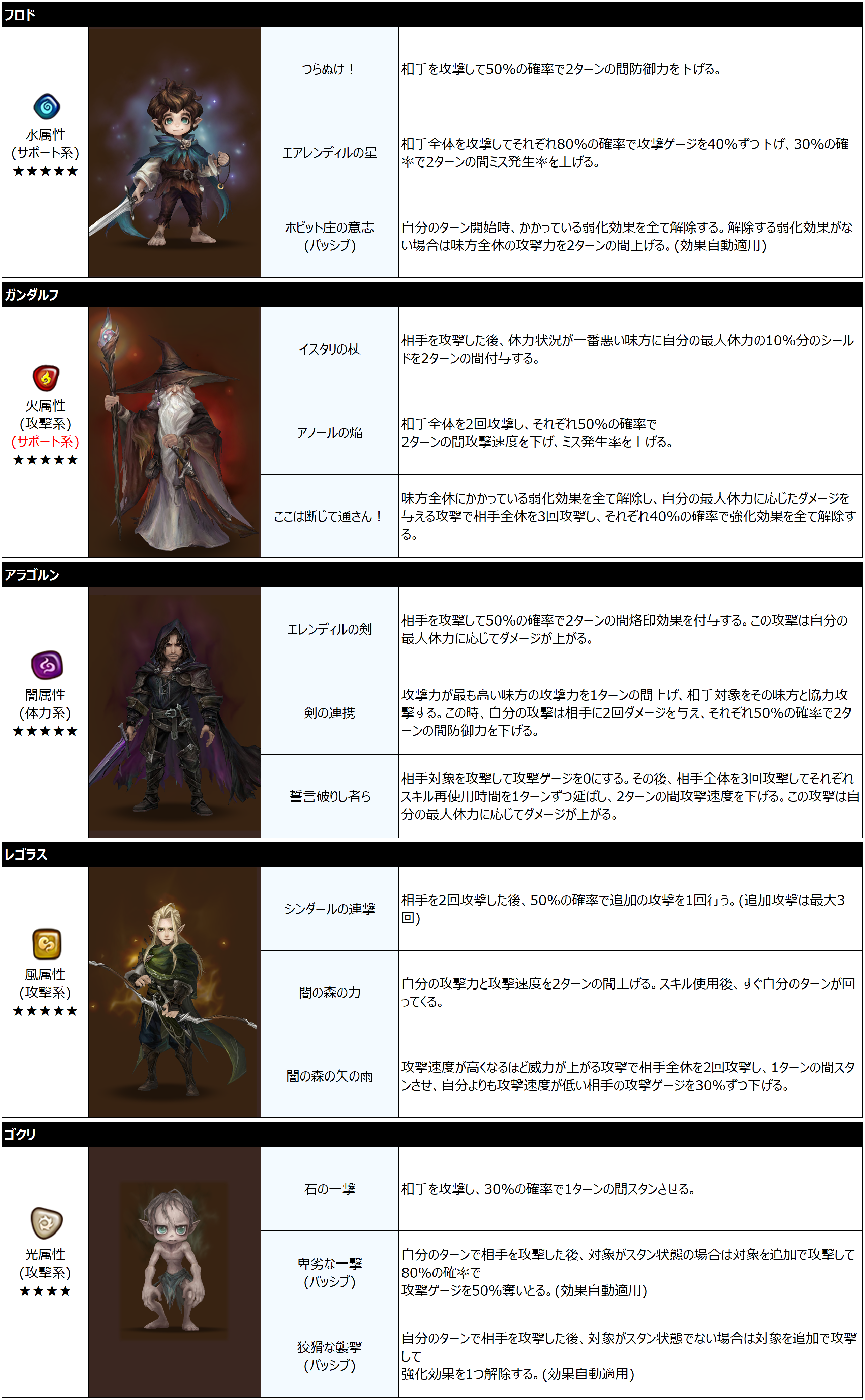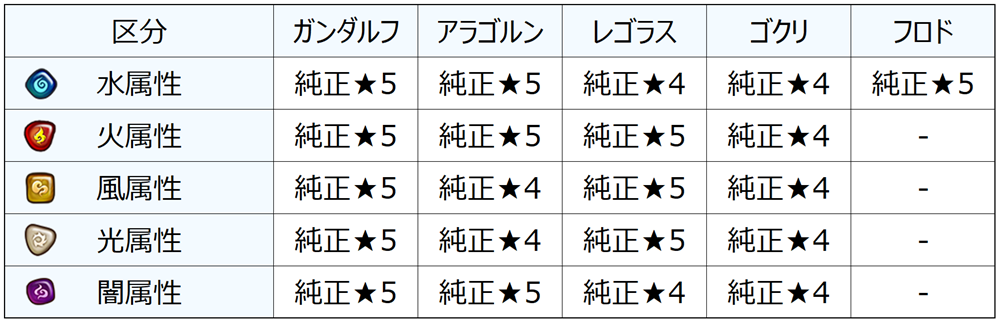 『The Lord of the Rings』コラボキャラクターはこれまでのコラボと同様に「未覚醒状態なし、固有のキャラクターの名を持つ覚醒済み」の形態で追加される予定です。また、一部のコラボキャラクターは属性に応じて純正★4だったり純正★5だったりします。