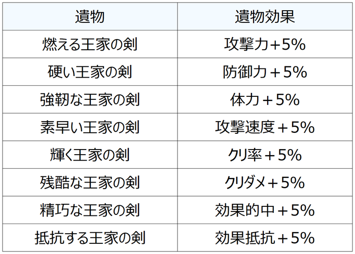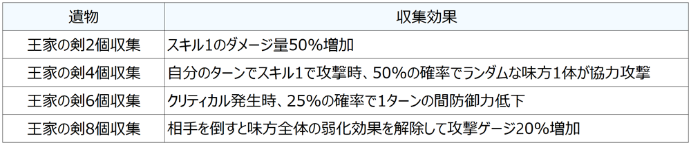 さらに、同じ遺物を複数獲得した場合は接頭語効果が重複して適用されるだけでなく、特別な効果が追加で付与されます。「王家の剣」の場合、獲得個数に応じて以下の特殊効果が追加で付与されます。