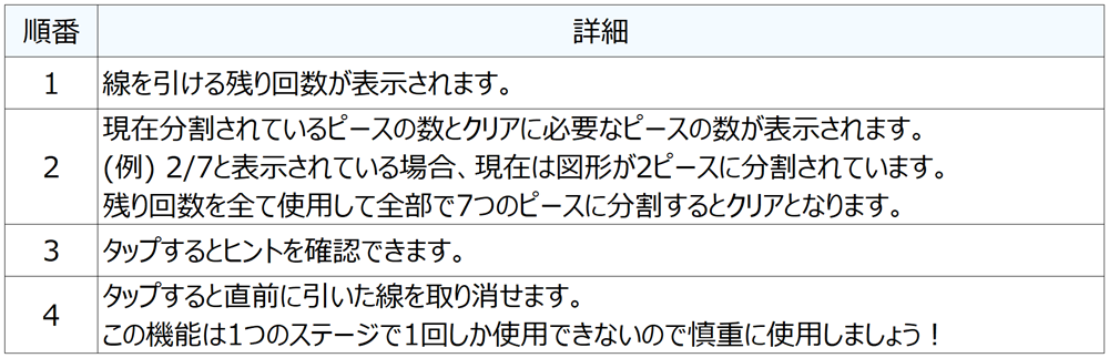線を引く回数が指定された回数よりも多かった場合や少なかった場合、目標のピース数よりも多く分割した場合はクリア失敗となります。