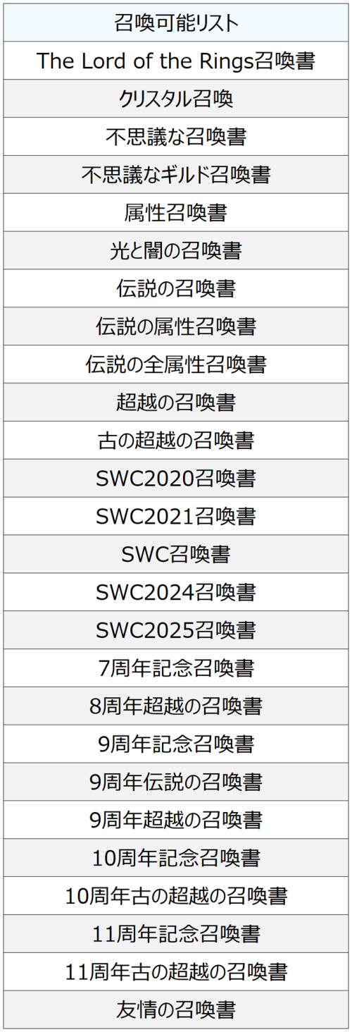 例外として、「The Lord of the Rings召喚書」を使用した召喚ではコラボ期間終了後でも『The Lord of the Rings』コラボキャラクターの召喚が可能です。
