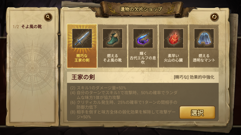 ステージをクリアすると、全15種類の遺物のうちランダムな5種類がショップに並び、そのうち1種類の遺物を購入できます。これらの遺物は召喚士さまのモンスターにさまざまな効果を付与します。「影の国」のクリアに役立つでしょう。
