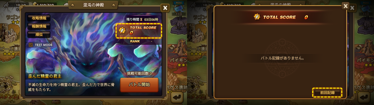 :混沌の神殿の詳細ウィンドウの【TOTAL SCORE】をタップすると表示されるトータルスコアポップアップの下部に「過去の記録」を確認できるボタンが追加されます。