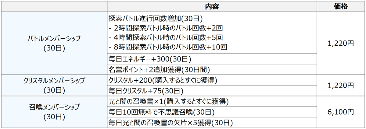 ※バトルメンバーシップに含まれる「探索バトル進行回数増加」効果は、探索バトル利用時に設定した時間の基本バトル回数に追加回数が加算される新たな特典です。
