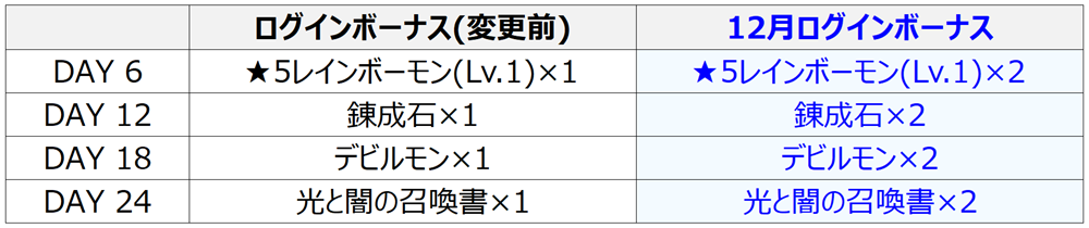 – 12月限定で、ログインボーナスに以下の特別ボーナスが適用されます。