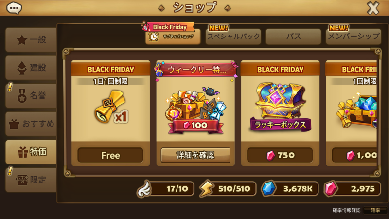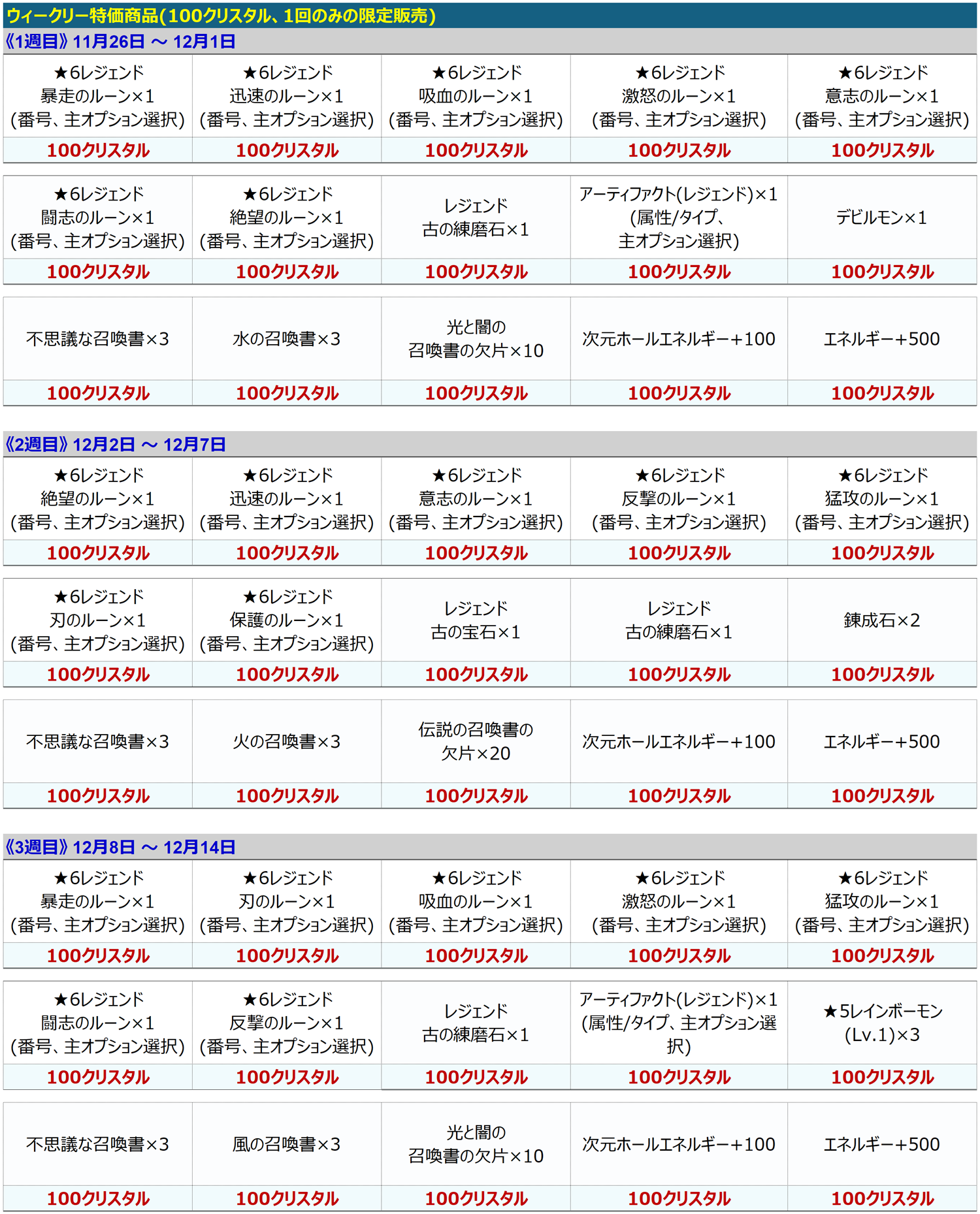 – 1週間購入できる、特価商品で構成された【ウィークリー特価商品】が3週間登場します。各週の販売期間および購入できる商品のリストは以下の通りです。